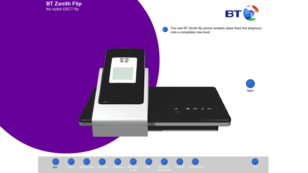 Feel Design were approached by Jacqui, a BT training manager, who wanted interactive materials, with animation, voiceovers and interactivity, to be distributed via CD Rom. She had been recommended to us by another form for whom we had produced interactive media using Macromedia Flash technology, one of our specialisms since starting in 2000, having trained in Macromedia Director, and then Flash, whilst studying an MSc in Huddersfield in 2000. We worked with Dan from 3D State, who we have worked with many times before, to model the 3 D elements and worked with our old friend, actor David Corden to record the voiceovers. We will be producing several more of these next year.
